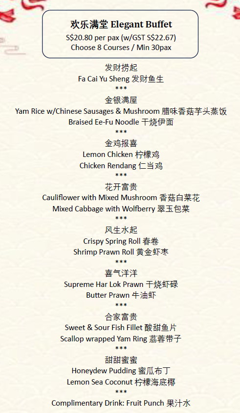 Side Order Table: {Table:101} Chair (Set of 5): {Chair:102} Service Staff: {Staff:158} Yu Sheng (Big): {YS25:152} Yu Sheng w/Abalone: {YSA:169} Pineapple Tart: {PT:153} Fortune Kek Lapis: {FKL:170}