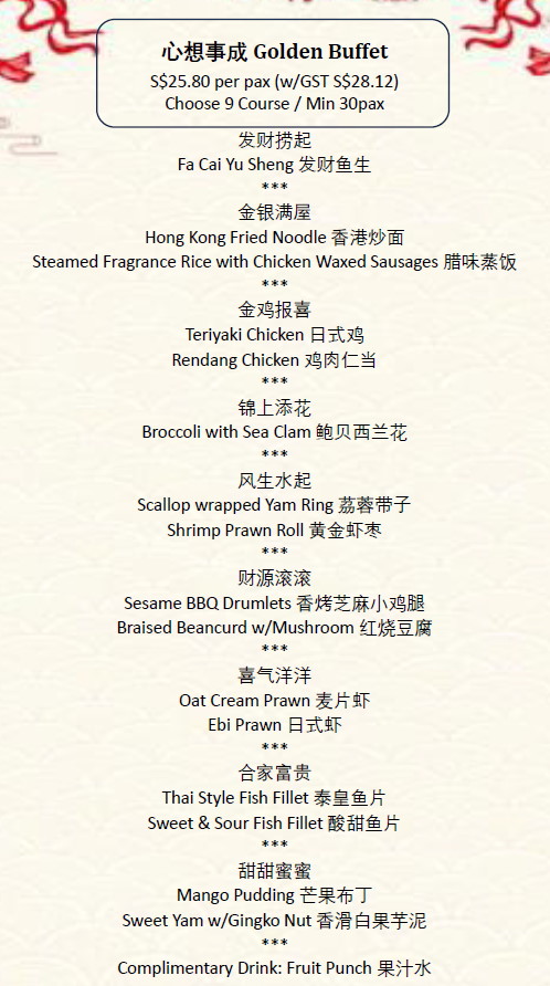 Side Order Table: {Table:101} Chair (Set of 5): {Chair:102} Service Staff: {Staff:165} Yu Sheng (Big): {YS25:152} Yu Sheng w/Abalone: {YSA:169} Pineapple Tart: {PT:153} Fortune Kek Lapis: {FKL:170}