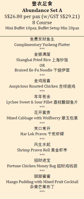 Side Order Yu Sheng (Big): {YS25:152} Yu Sheng w/Abalone: {YSA:162} Pineapple Tart: {PT:153} Fortune Kek Lapis: {FKL:163}