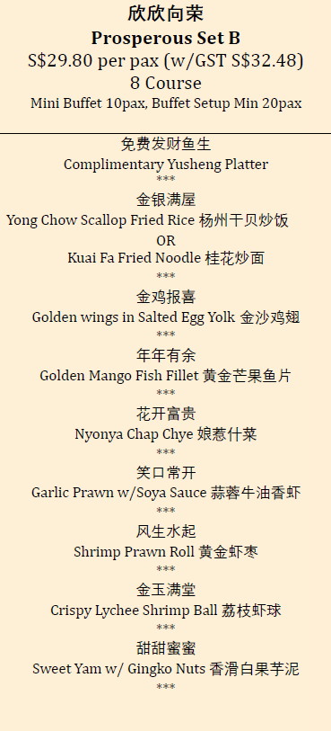 Side Order Yu Sheng (Big): {YS25:152} Yu Sheng w/Abalone: {YSA:162} Pineapple Tart: {PT:153} Fortune Kek Lapis: {FKL:163}